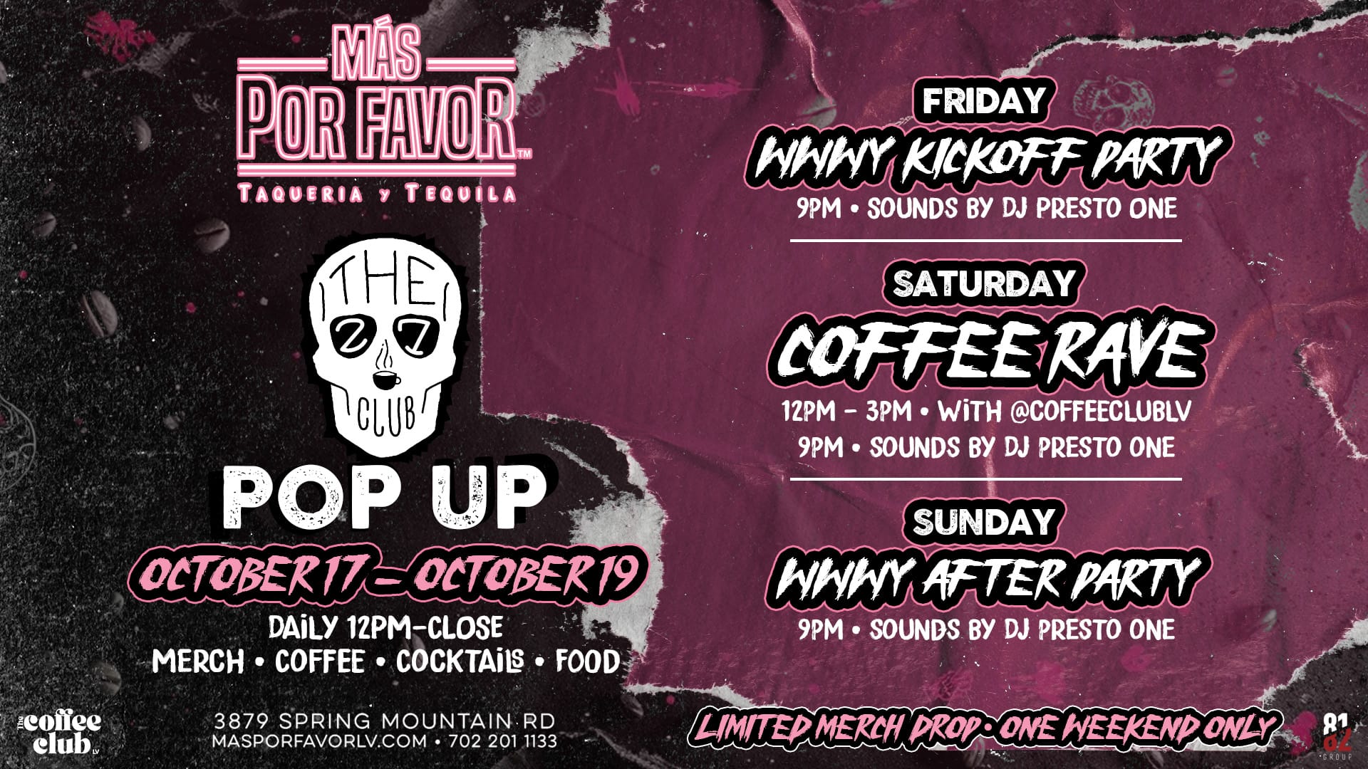Join us for a one-weekend-only collaboration between The 27 Club Coffee and Más Por Favor Taqueria y Tequila, featuring exclusive coffee creations, signature cocktails, limited-edition merch, and festival-weekend vibes.