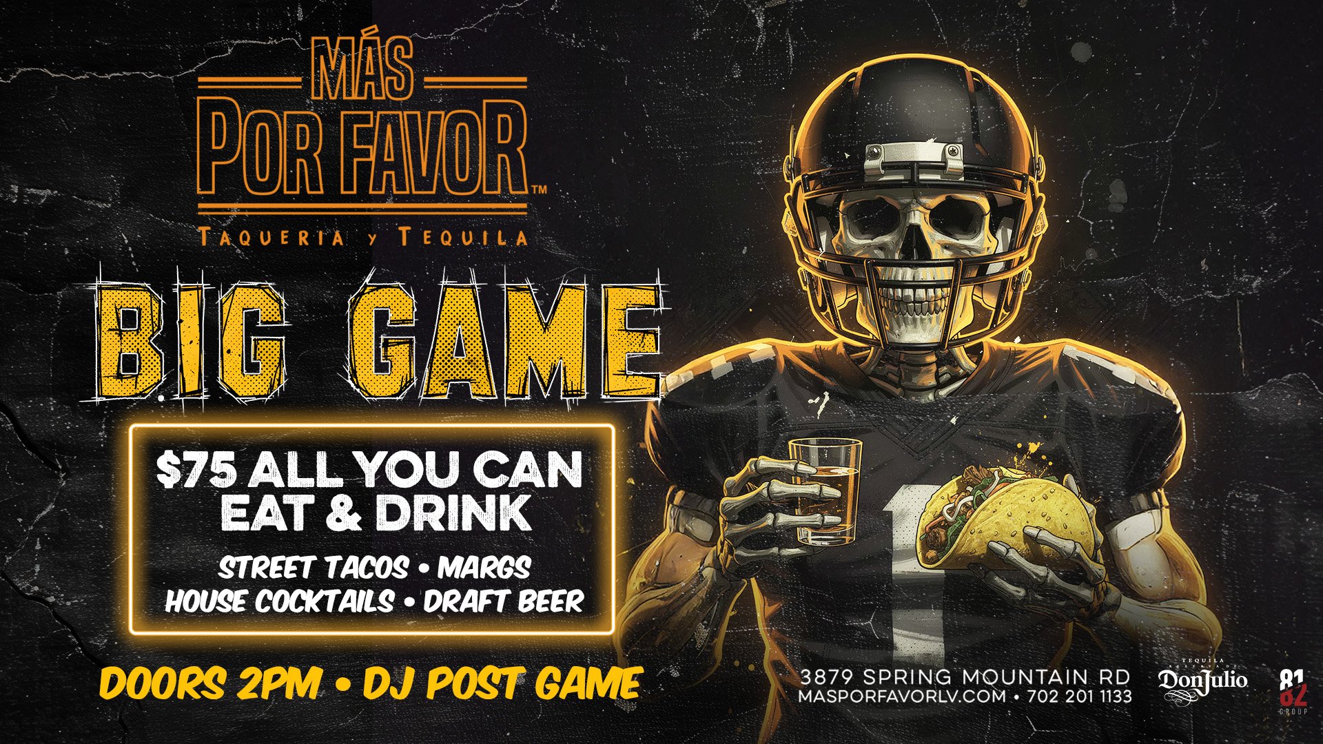 Big Game at Más Por Favor 🏈$75 All You Can Eat & Drink• Street Tacos• Margaritas• House Cocktails• Draft Beer