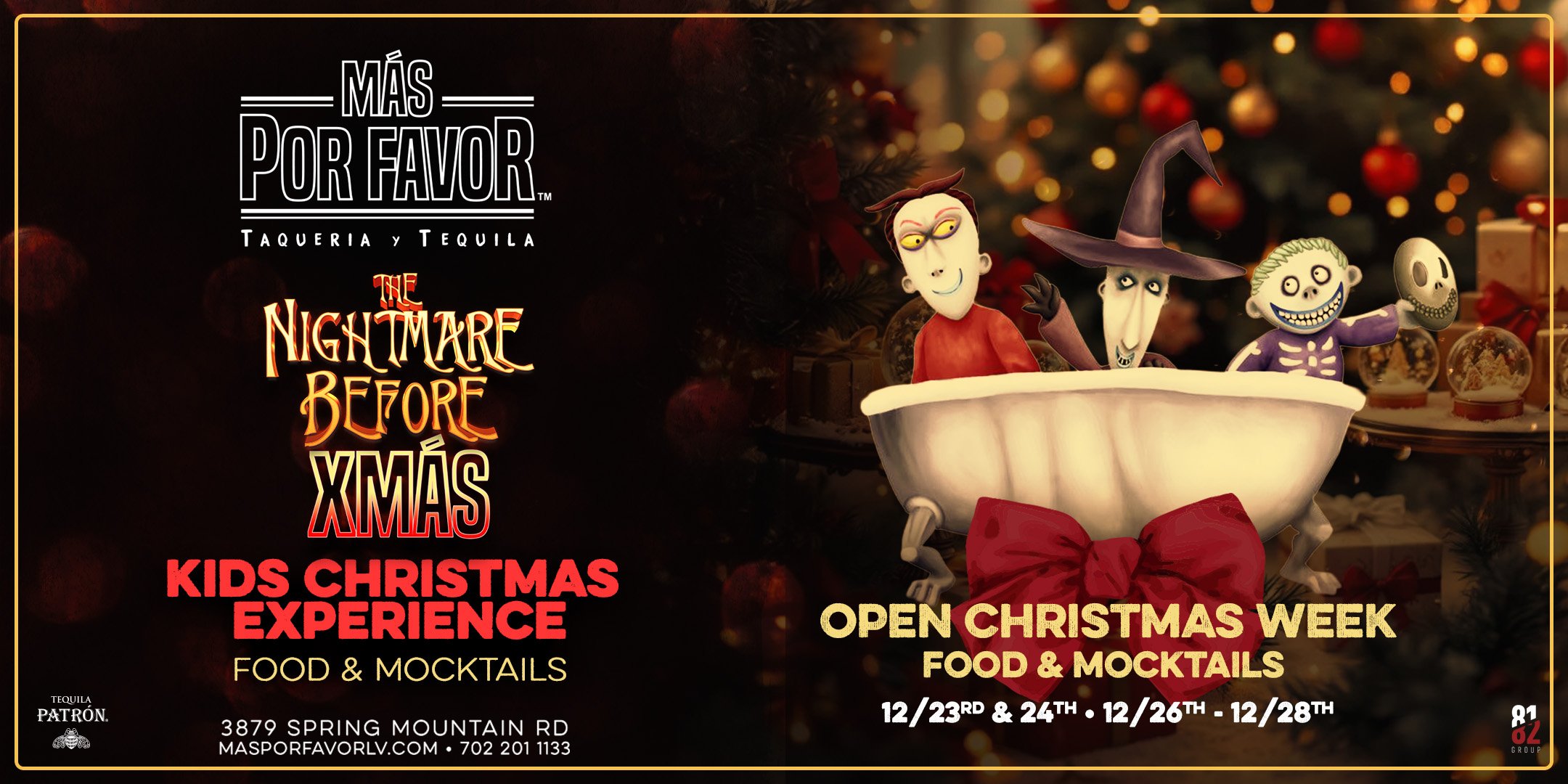 Step into a spooky-cute holiday world where Christmas meets Halloween — The Nightmare Before X-Mas is back at Más Por Favor for a family-friendly Kids Christmas Experience all week long.